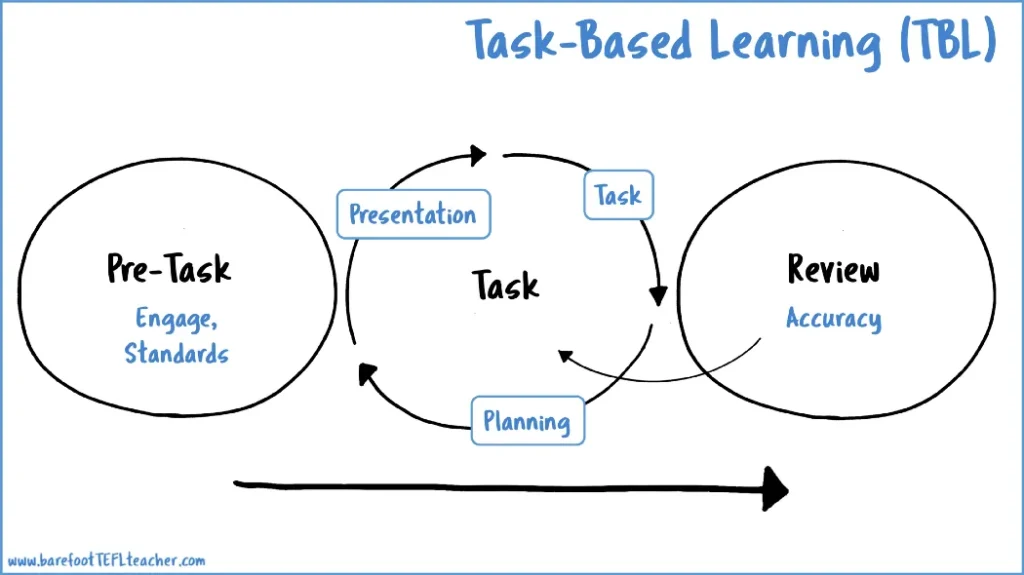This method focuses on the use of authentic language to complete meaningful tasks in the target language. The focus is on communication and outcome not grammar drills. Target language is the primary language of the classroom but if it is needed their mother tongue can be used to explain complex task instructions or grammar/vocabulary points.